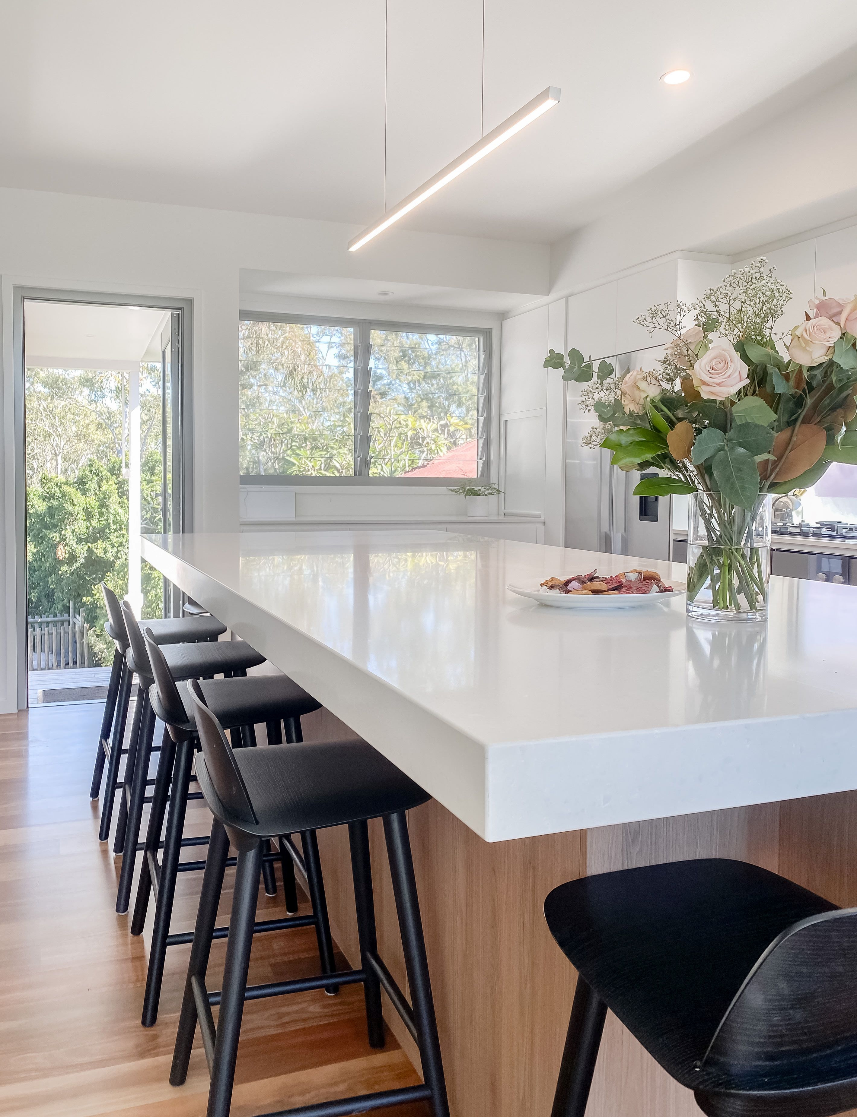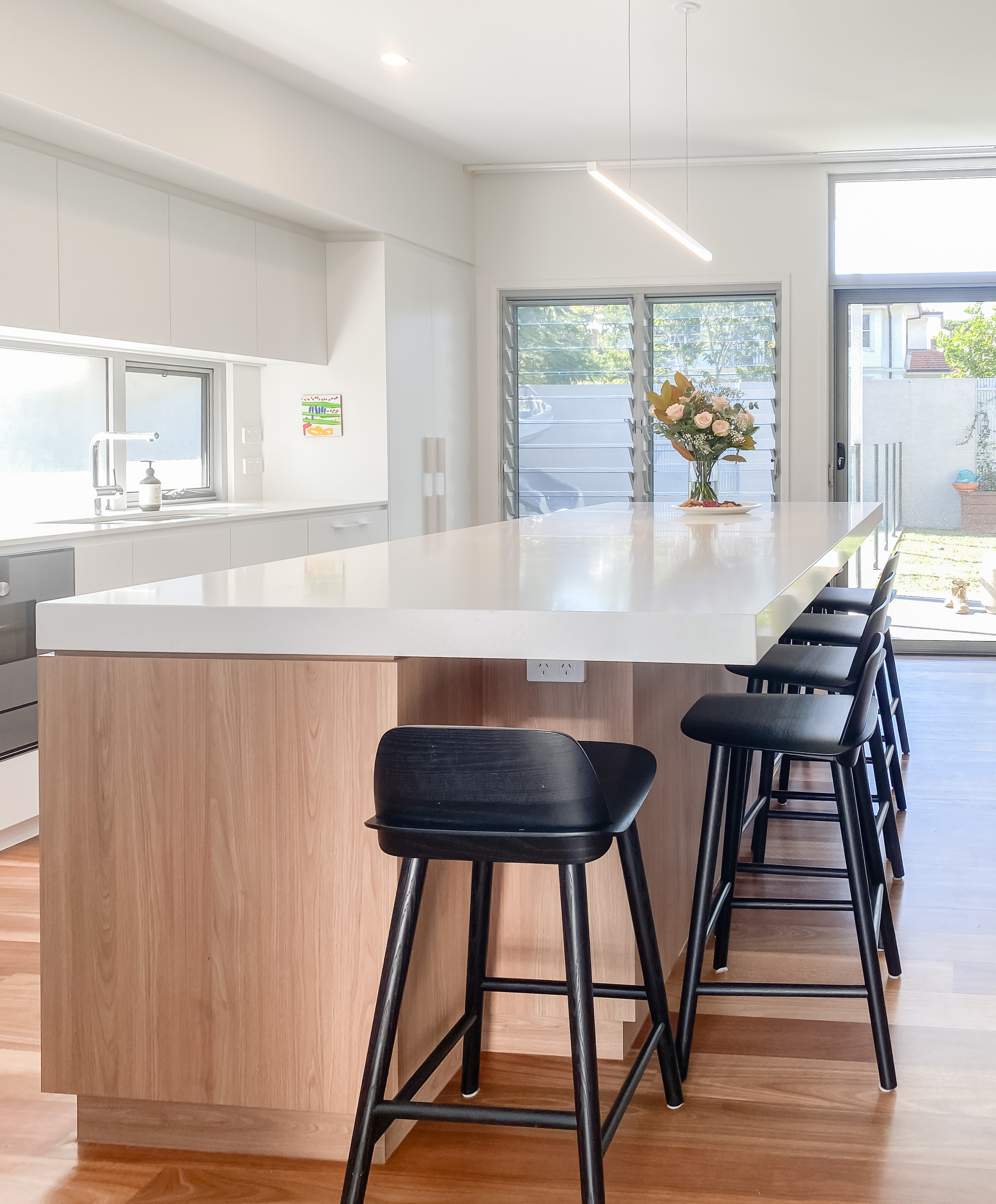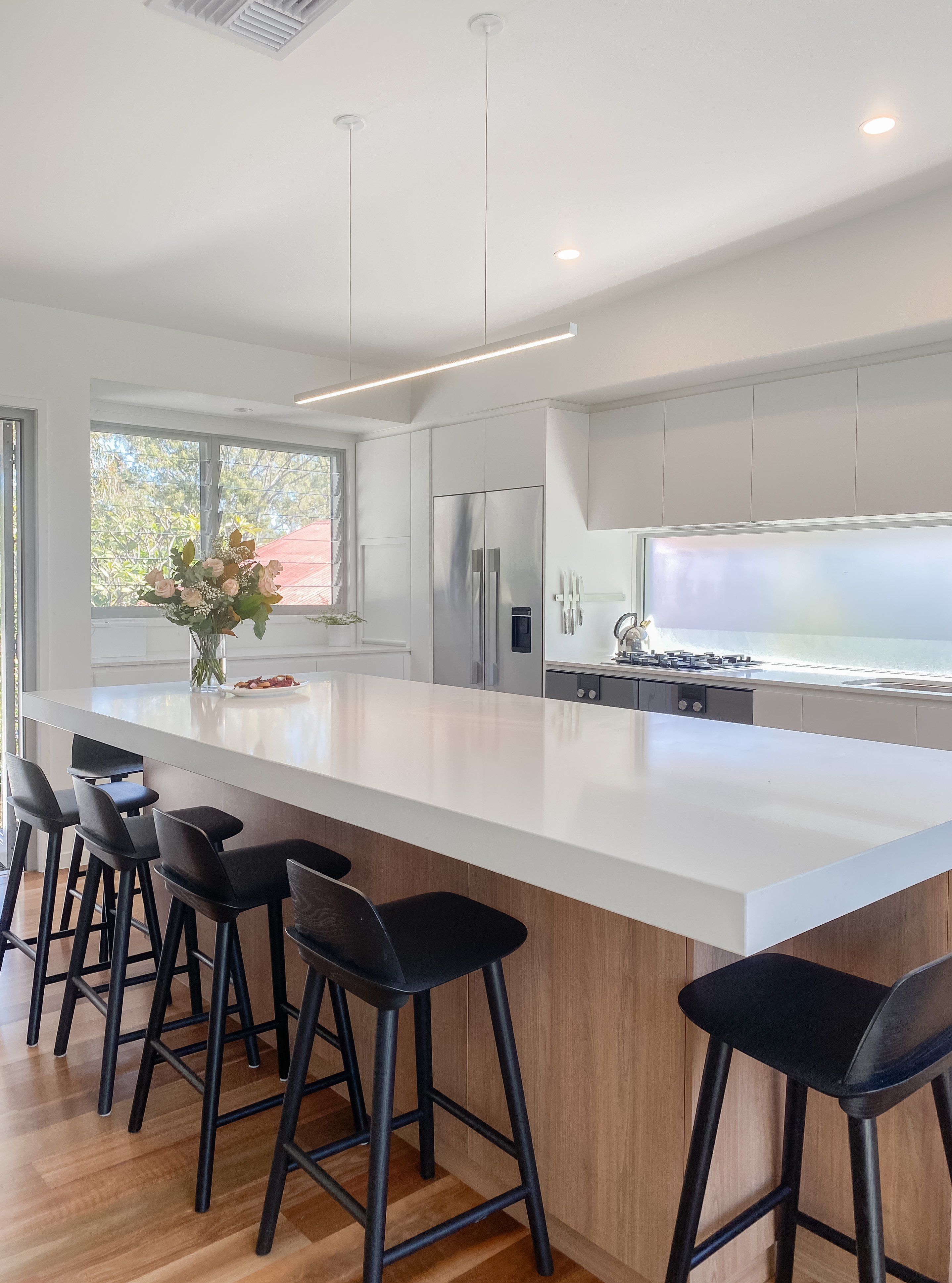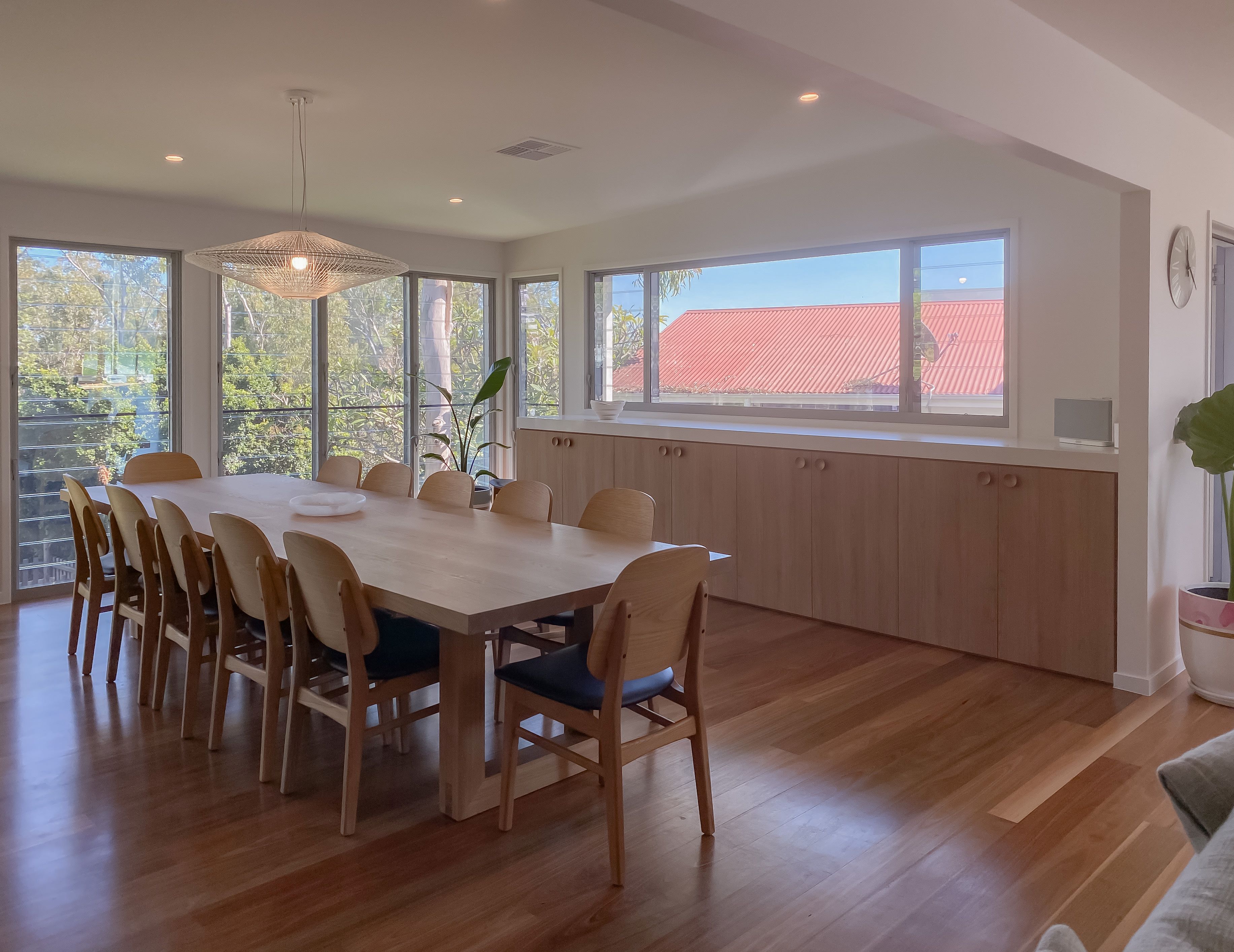 A 2020 project enclosing an existing deck to create a second light filled dining/living space, and outdoor room on the ground floor. The project also encompassed a new kitchen and an update of existing living areas and guest powder room with new feature lighting installed throughout.