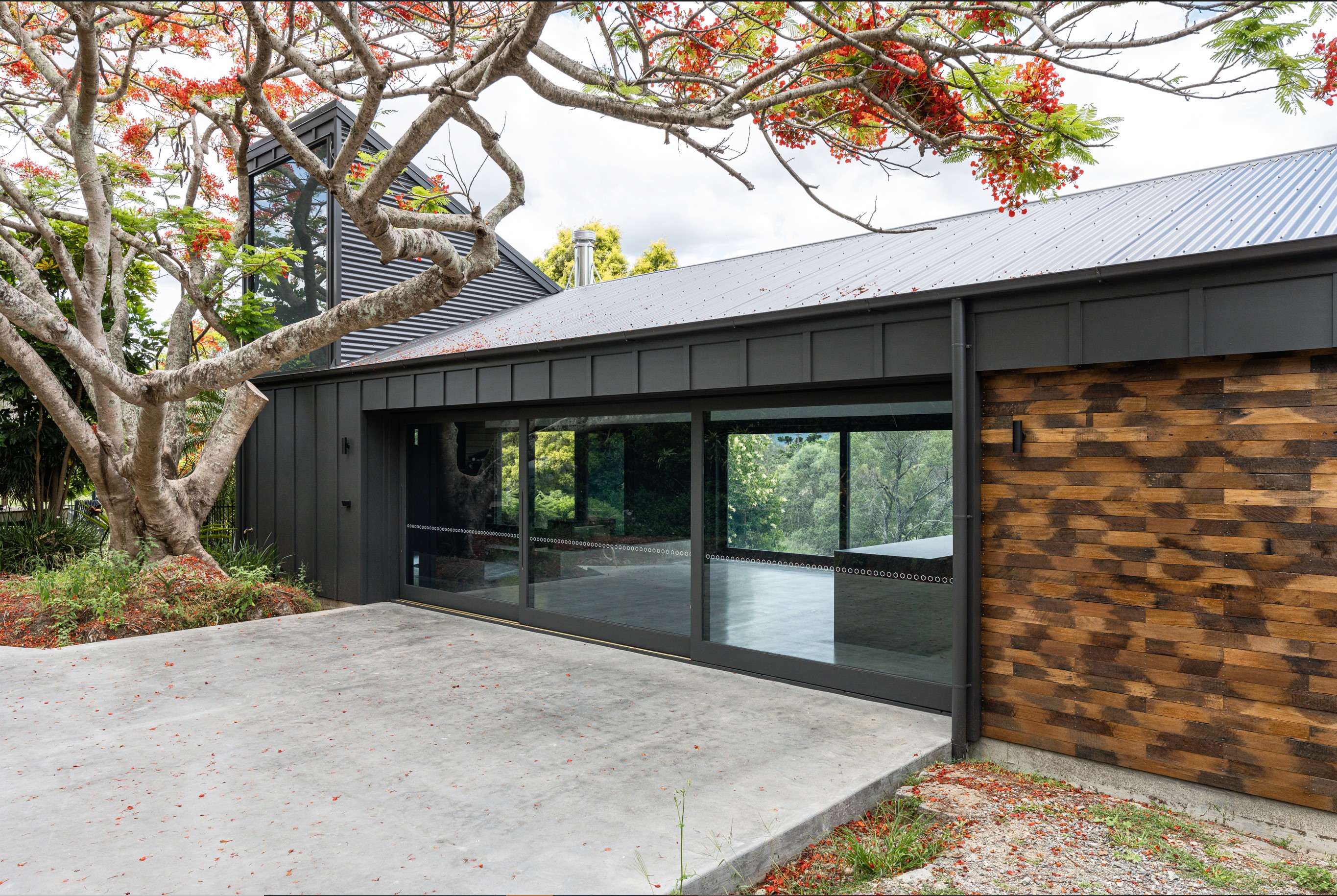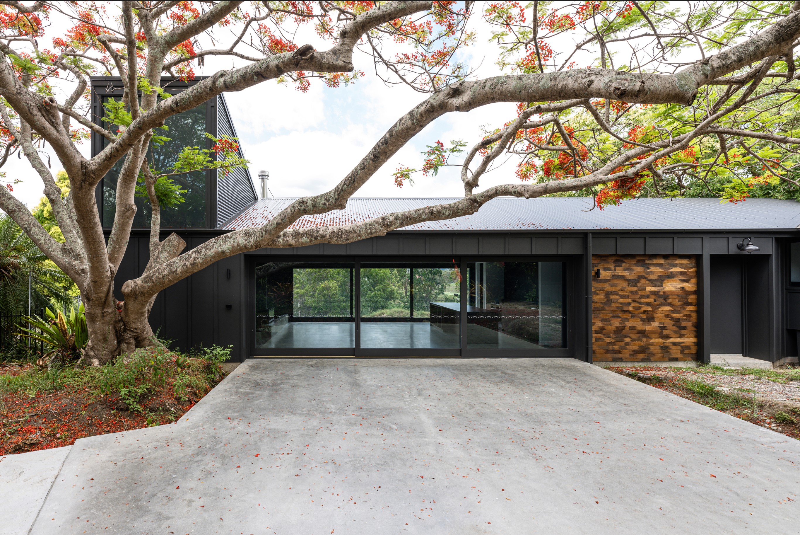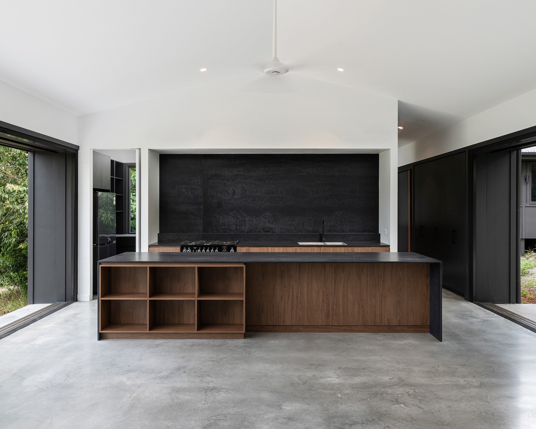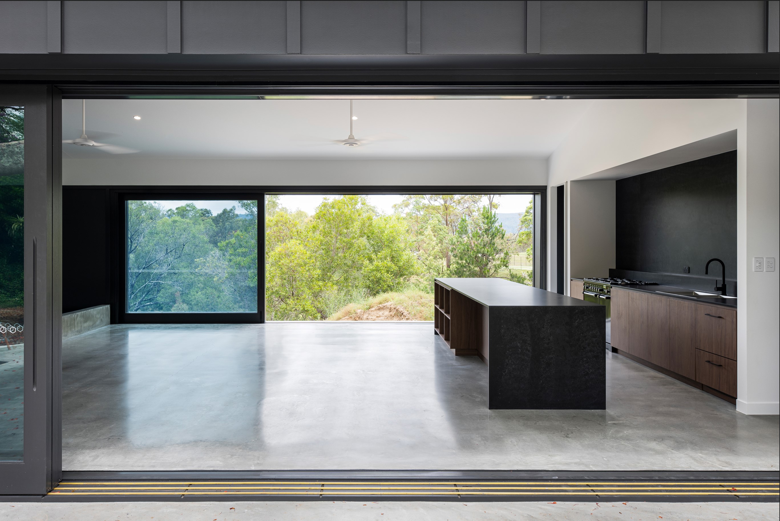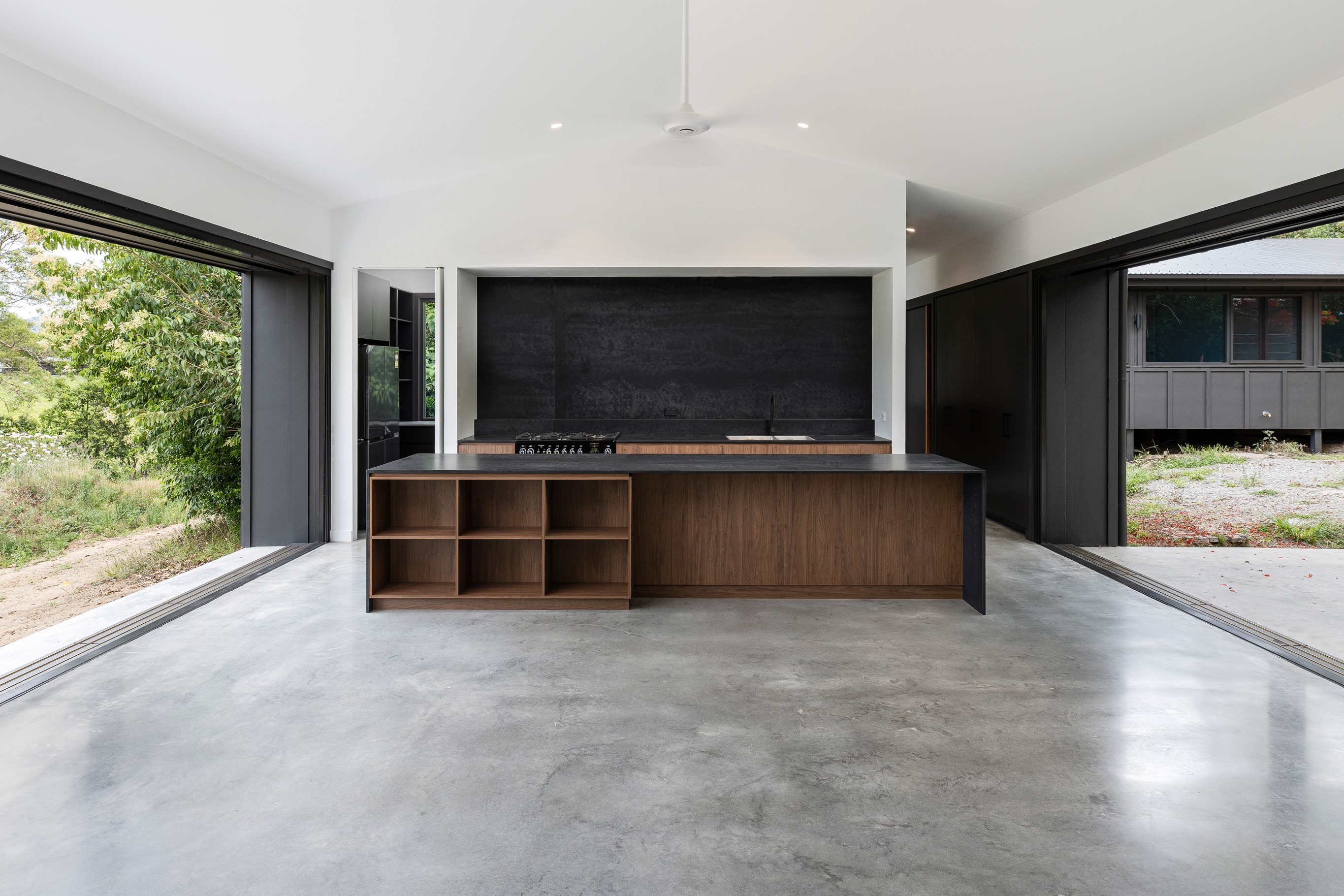 An extension and renovation of a small cottage in Samford Valley. Two extensions were added to the existing cottage, a master suite wing, and kitchen/living/dining wing more than tripling the footprint of the home. The extensions were large scale, with burnished concrete floors, high ceilings, dark joinery and big windows taking in the lush surrounding gardens and views. Completed 2022.