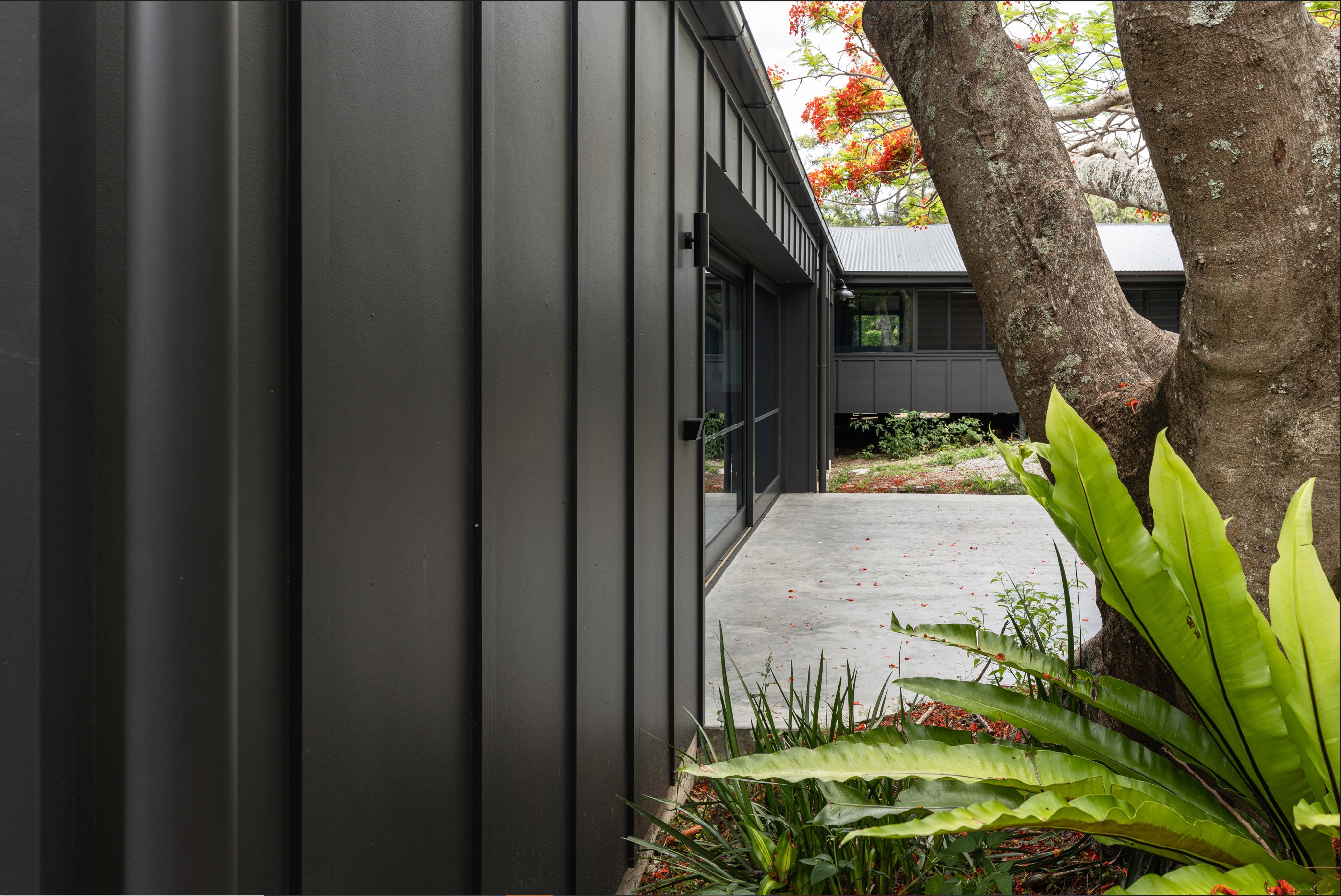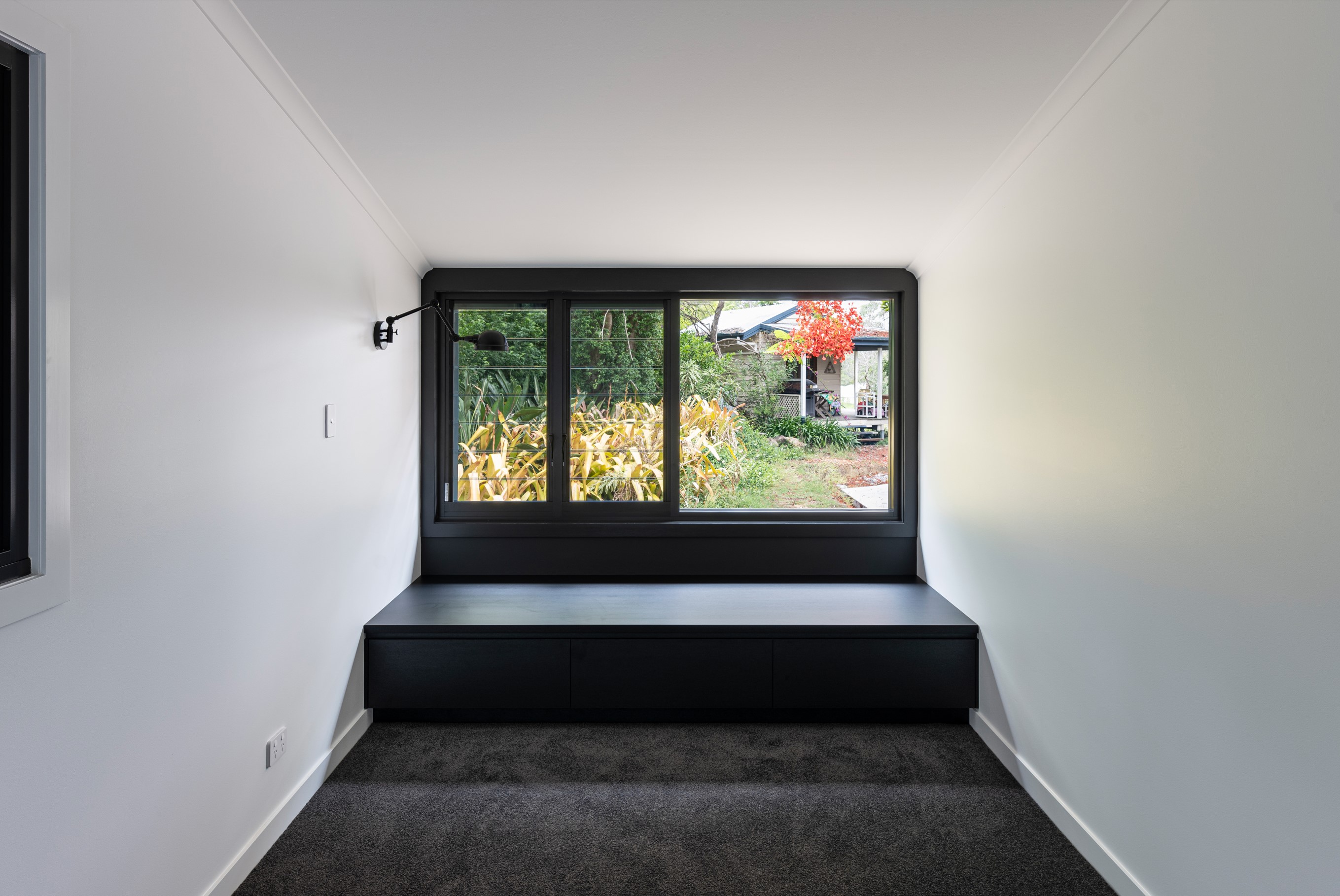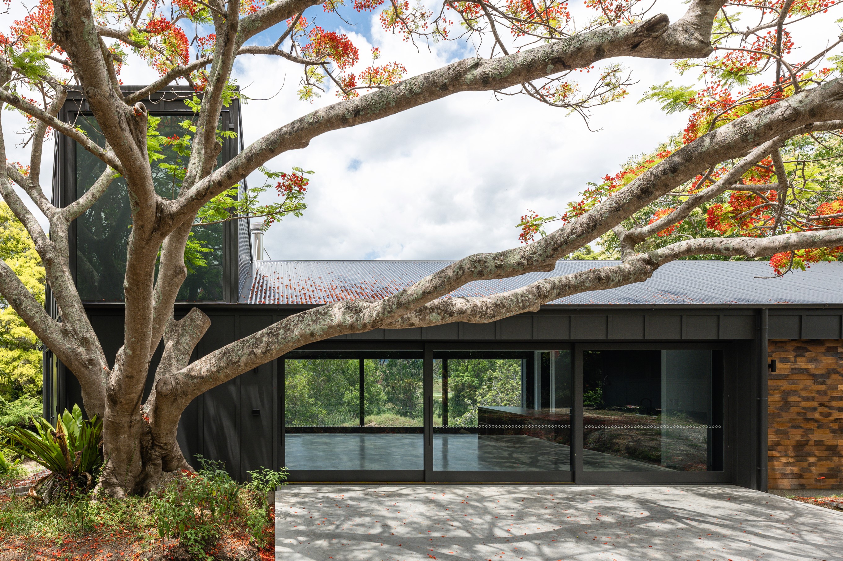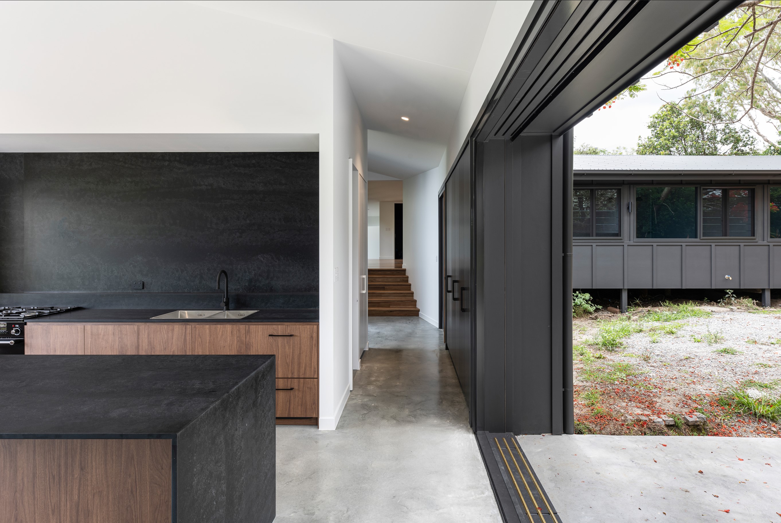 An extension and renovation of a small cottage in Samford Valley. Two extensions were added to the existing cottage, a master suite wing, and kitchen/living/dining wing more than tripling the footprint of the home. The extensions were large scale, with burnished concrete floors, high ceilings, dark joinery and big windows taking in the lush surrounding gardens and views. Completed 2022.
