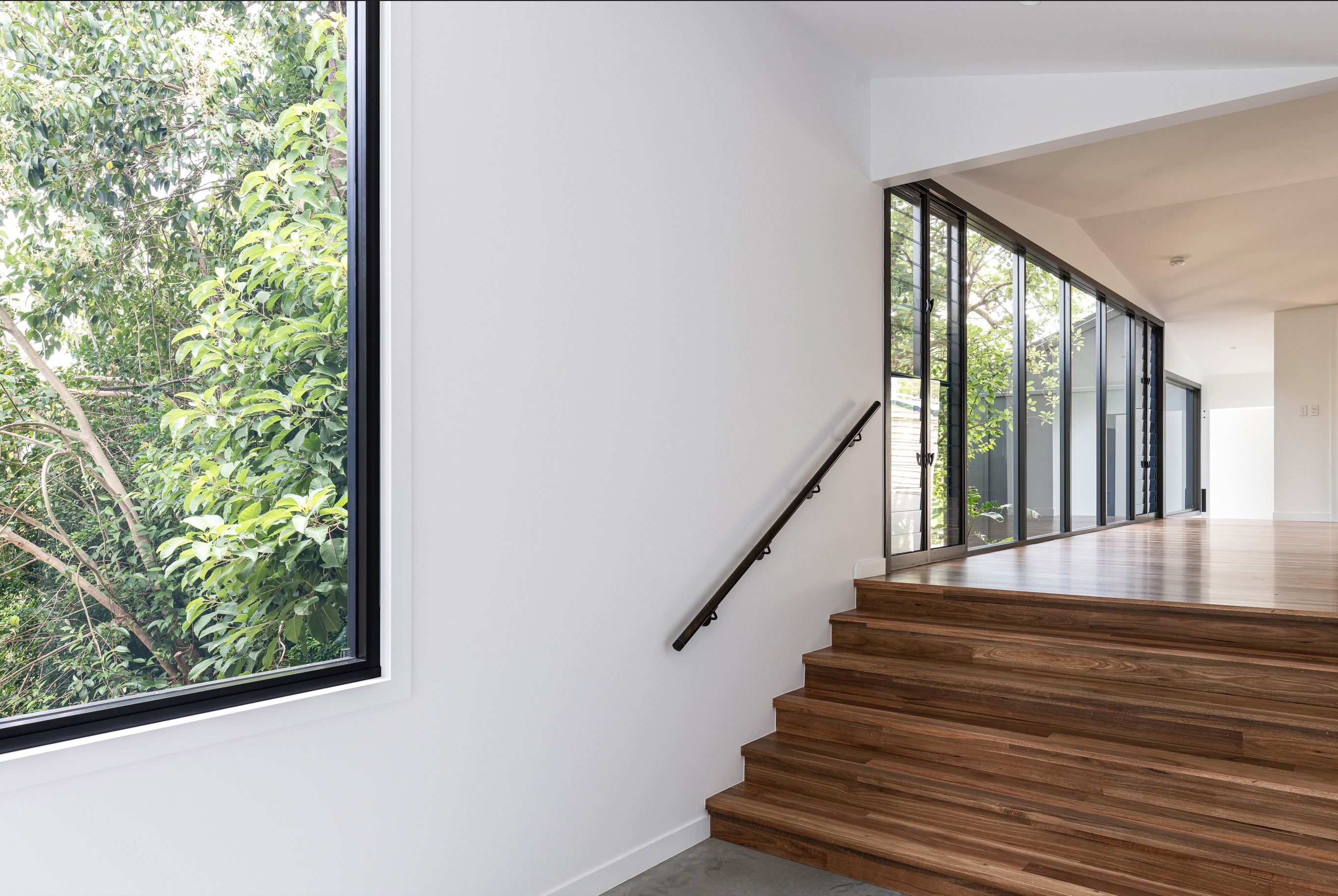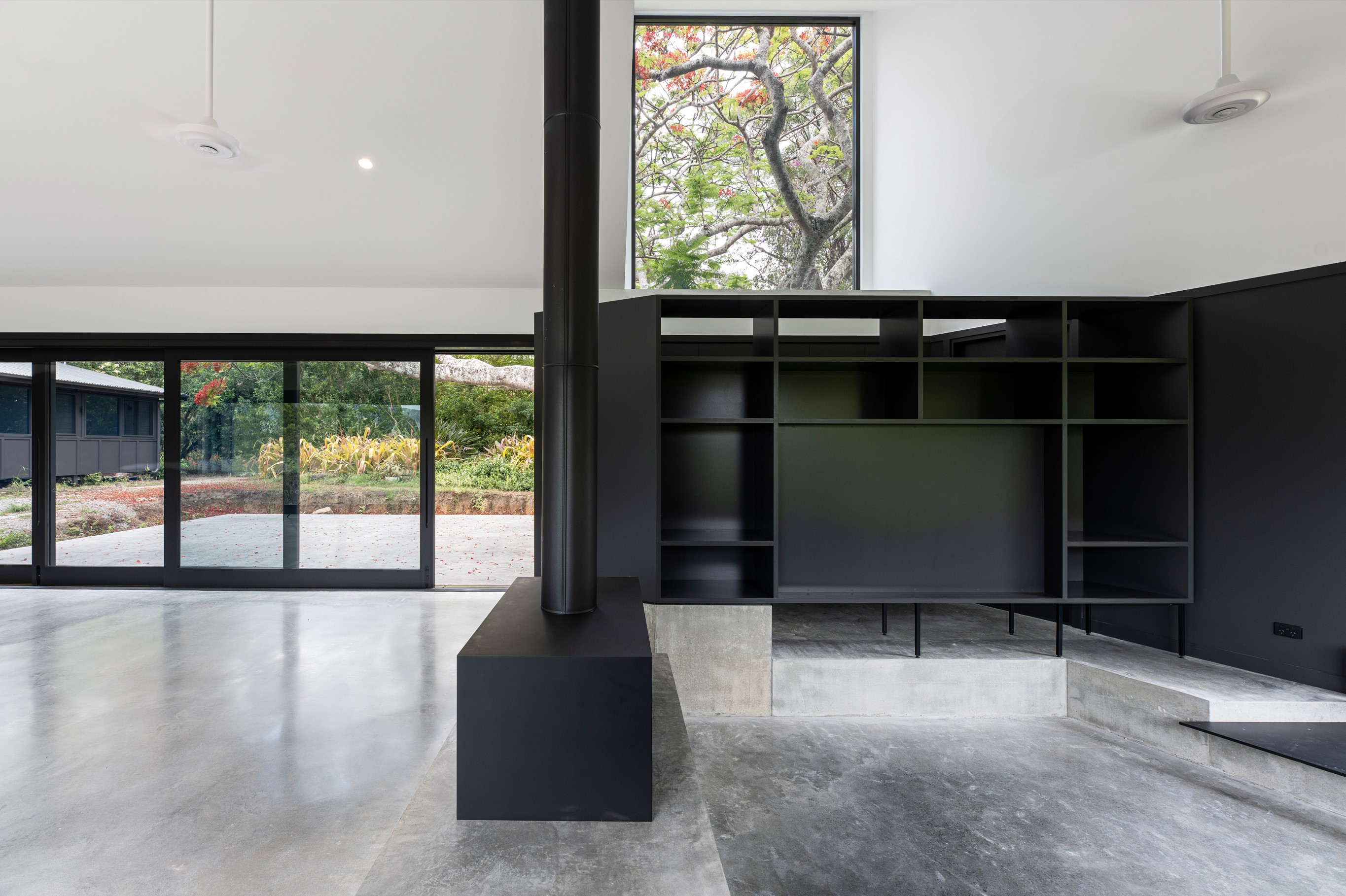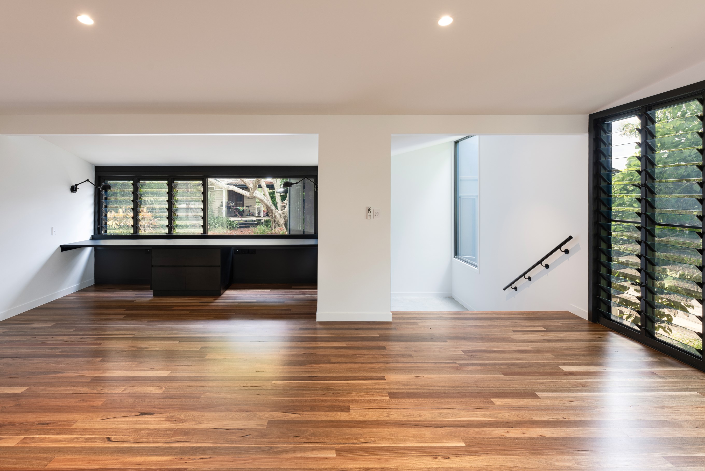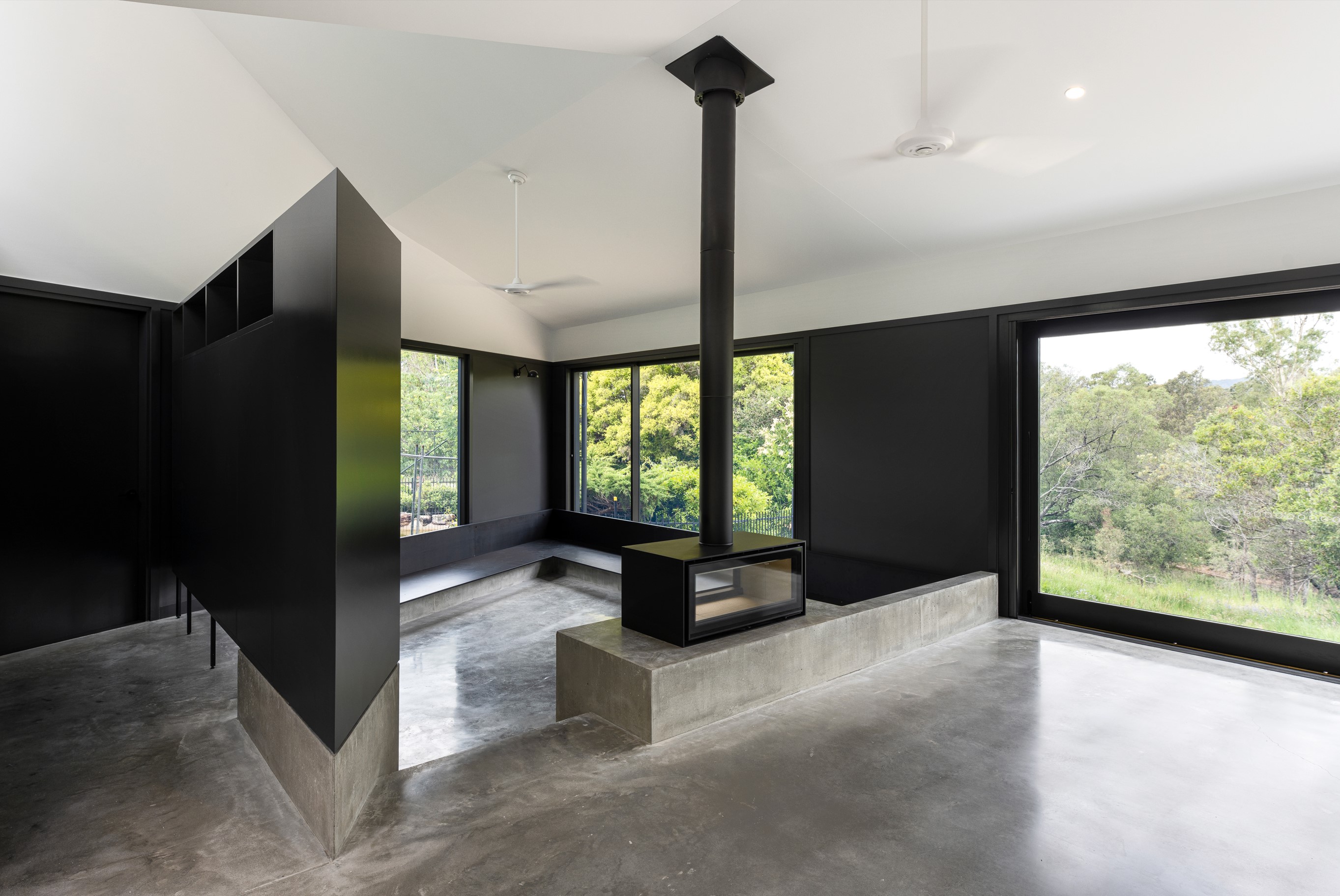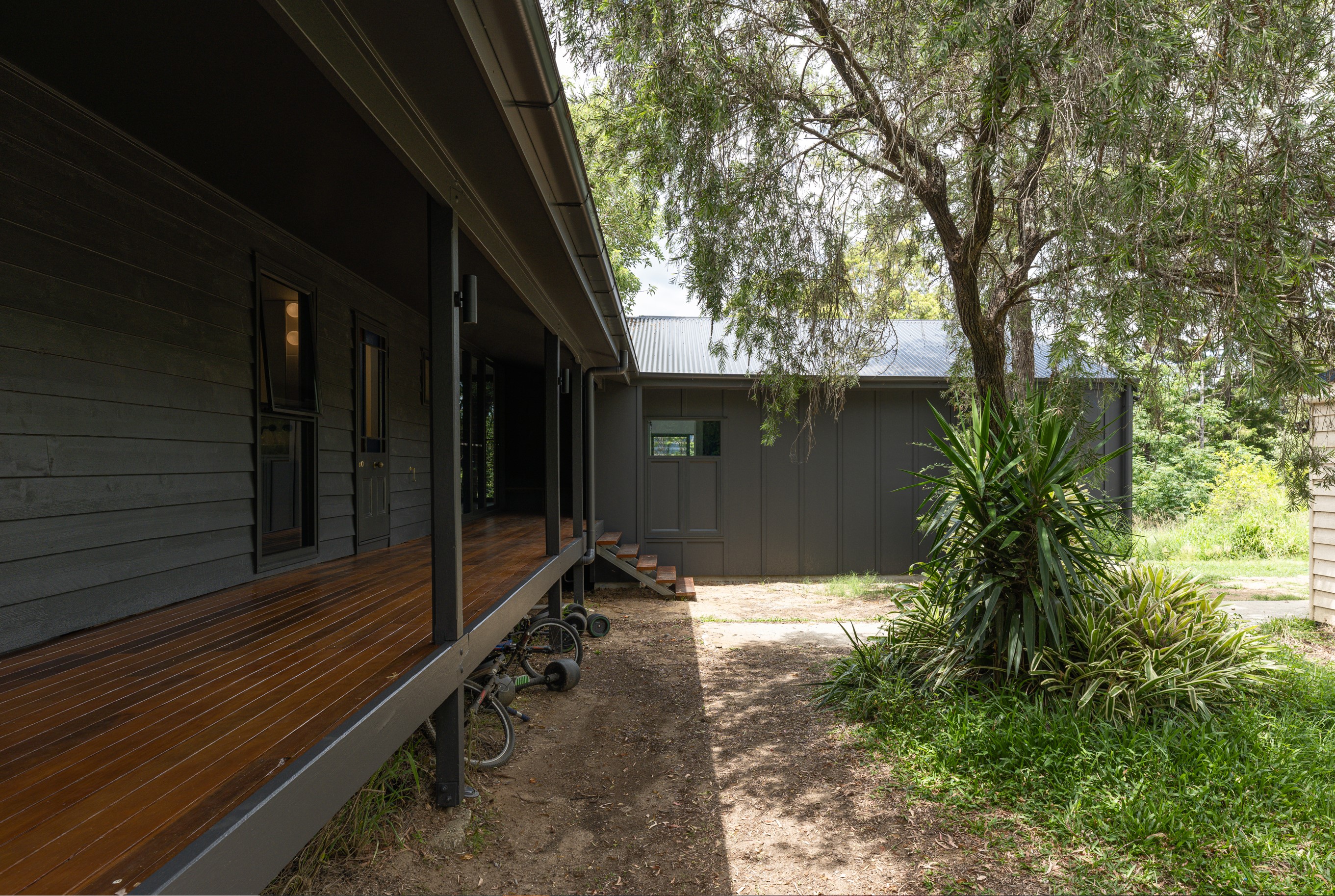 An extension and renovation of a small cottage in Samford Valley. Two extensions were added to the existing cottage, a master suite wing, and kitchen/living/dining wing more than tripling the footprint of the home. The extensions were large scale, with burnished concrete floors, high ceilings, dark joinery and big windows taking in the lush surrounding gardens and views. Completed 2022.